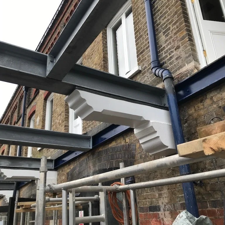 In order to save time in construction, the balustrade sections were powder coated off site. The beams, columns and stanchions were painted in the workshop which has also provided a welcome space for the workmen to get dry and have a cup of tea.